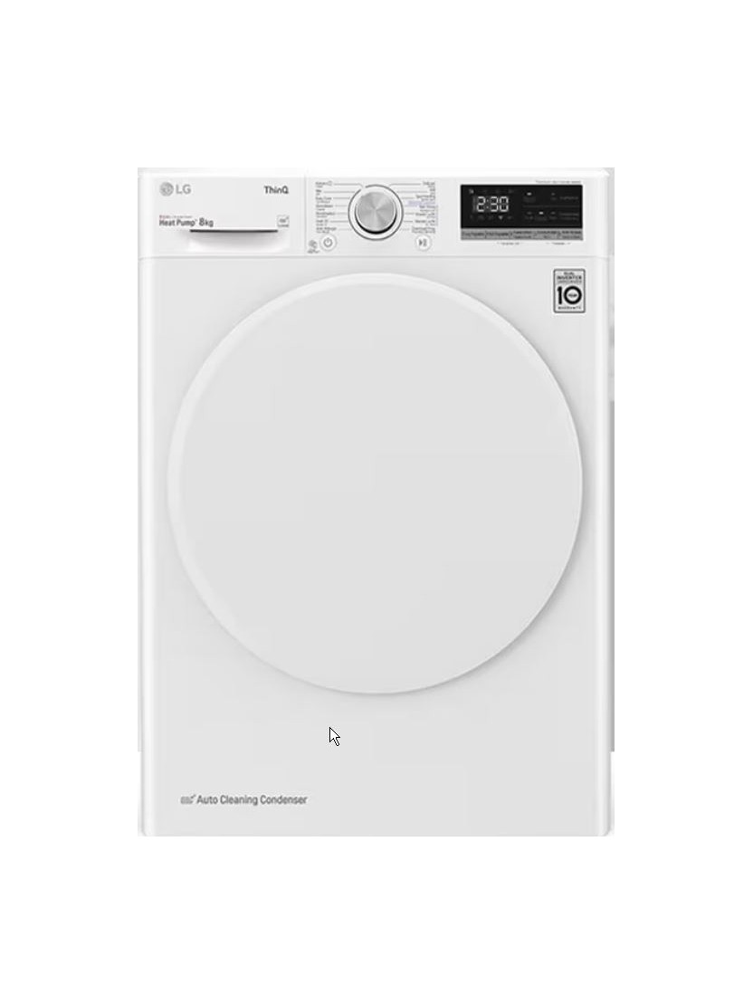 De LG RH80V5AV0N is een energiezuinige warmtepompdroger met een ruime 8 kg trommelinhoud, ideaal voor gezinnen of huishoudens die regelmatig wassen. Dankzij de DUAL Inverter Heat Pump™ droogt deze machine niet alleen sneller, maar ook stiller en efficiënter dan een traditionele condensdroger.